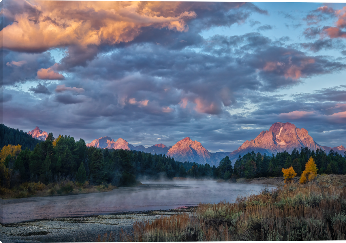 Morning Golden Rays shows huge mountains with a sunrise that can't be beat! Sun just starting to come out from the clouds and highlighting the tall peaks with colorful golden rays! This would be a great scene to wake up each morning and enjoy in your own home!