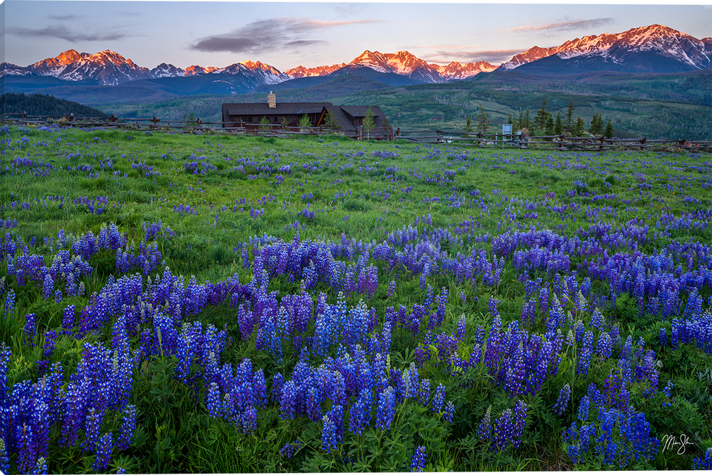 Blue and Purple flowers galore in this mountain scene! A big ranch house in the background with huge snowy mountains basking in the sunrise. This would be quite the scene to add to your home or office!