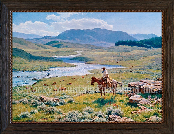 Custom Framed - giclee canvas art print using all archival materials. This artwork is shipped fully insured and will be ready to hang on your wall. Framed Size: 17 x 23. Allow 2 business weeks to shipment. (Note - The Rocky Mountain Publishing, Inc. white lettering is for website copyright images only - will not appear on framed piece.)