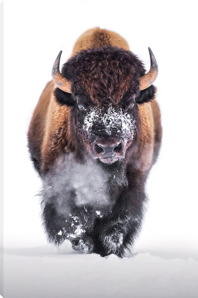 This mighty American Bison is working his way through thick snow and he's looking right at you!! This incredible photography catches his cold breath against a totally white background. He would look great hanging in your home or office!