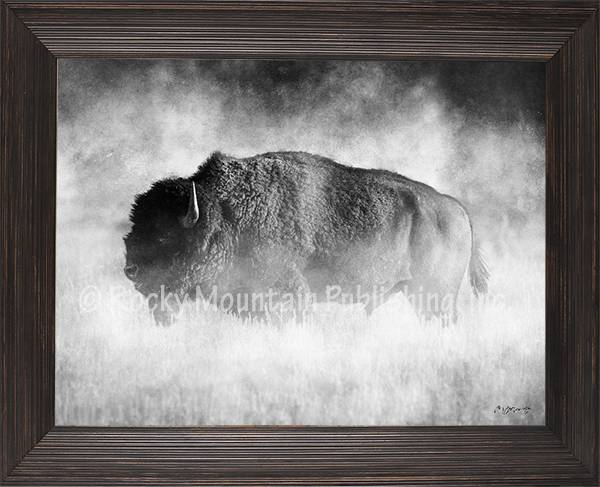 The American Bison is one of the biggest and heaviest animals of the west! When he's on the scene, he's huge and can be very intimidating. In this case he's raising quite a stir in the dust...or is it the wind blowing? However, he would look great hanging in your home or office!
