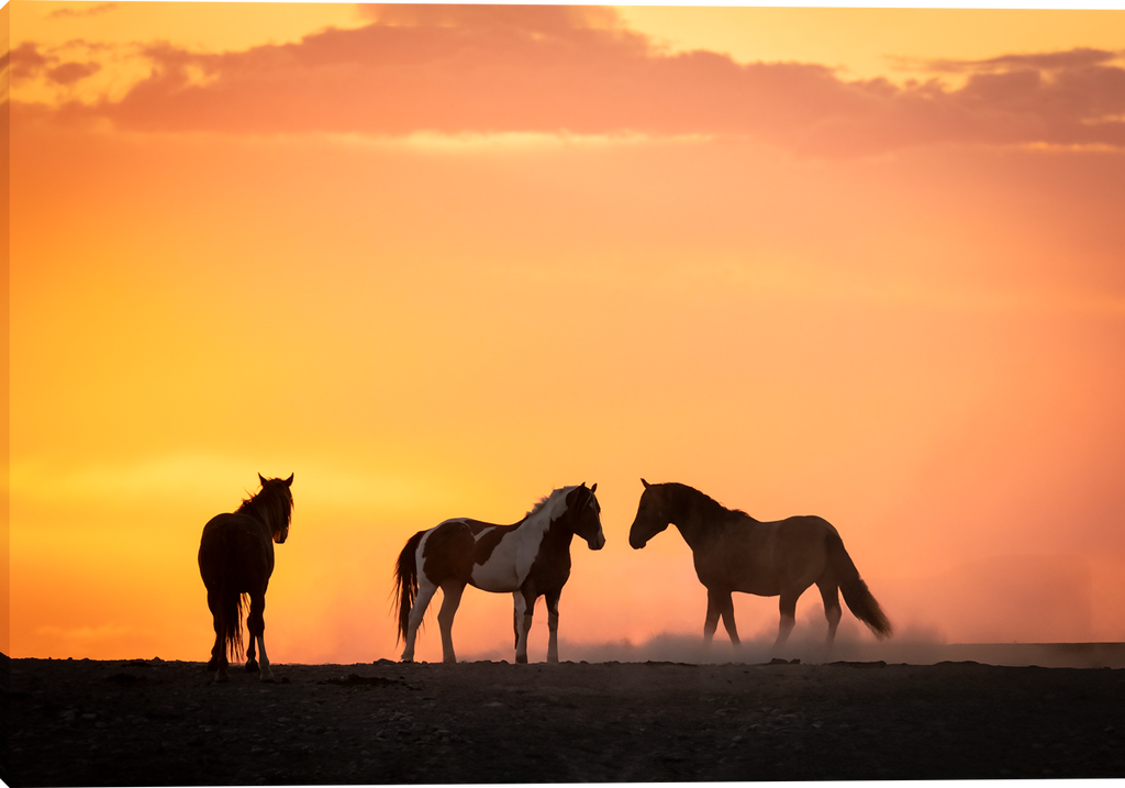 If you happen to own a horse ranch and seen your horses silhouettes against a bright and shiny sundown, then you know what this art print will look like! If you haven't then you can enjoy this scene by owning this canvas artwork for your home or office!