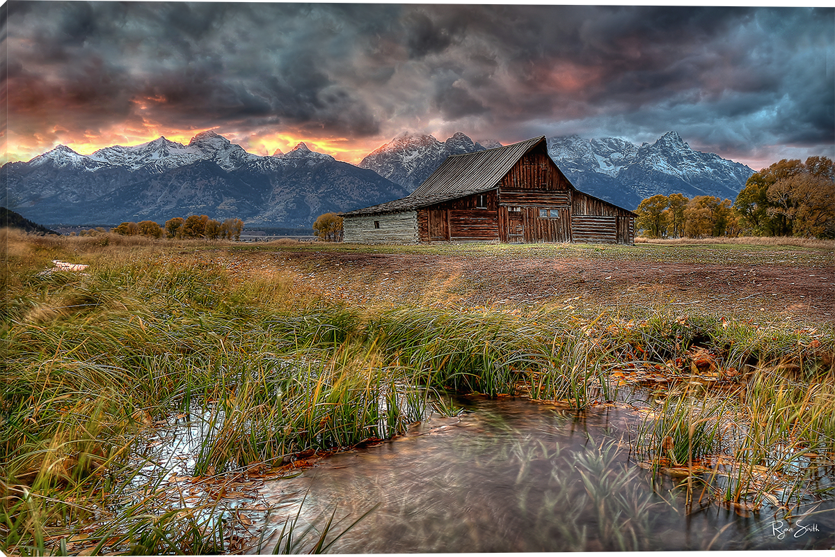 Teton Mountains with whole new look.  A gray sky above is threatening to erupt in a huge storm and the sun is just behind the mountains, but reflecting off the skies above.  It looks like the clouds are on fire.  Also a big barn in the forefront!  This could be hanging on your wall at home or office!  Take a look - it's gorgeous!